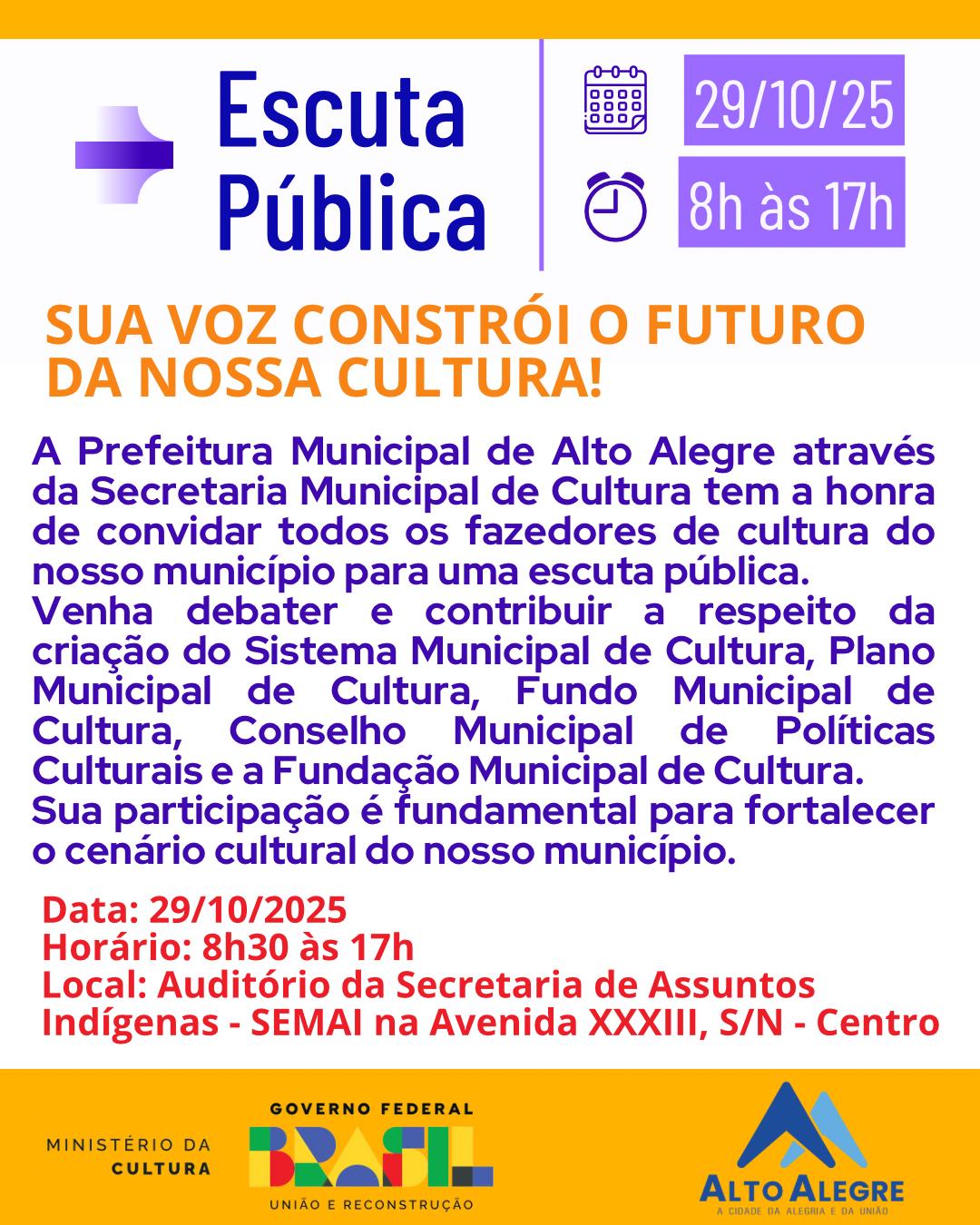 📚✨ Convite Especial! A Prefeitura Municipal de Alto Alegre, por meio da Secretaria de Educação e Desporto, convida toda a comunidade para a abertura da 1ª Exposição Literária e Empreendedora do Município de Alto Alegre. Será um dia memorável, com a participação de todas as escolas do município, apresentando seus trabalhos e projetos voltados ao desenvolvimento da leitura e da escrita dos nossos alunos. Um momento especial para celebrar o aprendizado, a criatividade e o talento da nossa rede educacional! 📍 Local: Praça Universitária 🕔 Horário: 17h00 📅 Data: 07 de novembro Prefeitura de Alto Alegre — A cidade da alegria e da união.